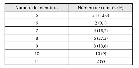 Se observa el número de miembros por comité; en aproximadamente el 30 % de los casos analizados se encontraron 8 miembros; 15 % de los comités tienen 9 o más miembros.