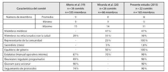 De acuerdo con su denominación, 12 comités (54 %) se definieron como independientes, 6 (27 %) como institucionales, 3 (13 %) institucionales e independientes, y en un solo caso (4,5 %) el comité no se identificó con ninguna de estas definiciones. El promedio de tiempo de funcionamiento de los comités fue de 9 años (rango 4-29 años). En el 100 % de los comités se evidenció en su composición un equilibrio de género con una proporción mujer-hombre de ≈1:1. El 77 % (17 comités) tenía un abogado como miembro del comité, en 13 % (3 comités) participó como miembro un sacerdote, y en el 9 % dos sacerdotes como representantes de la comunidad. En todos los comités evaluados se encontró siempre un miembro identificado como representante de la comunidad.