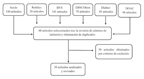 La búsqueda arrojó 60 documentos luego de la aplicación de los criterios de inclusión y la eliminación de duplicados. Tras la selección a partir de los criterios de exclusión se obtuvieron 30 artículos que fueron revisados en el presente estudio (figura 1).