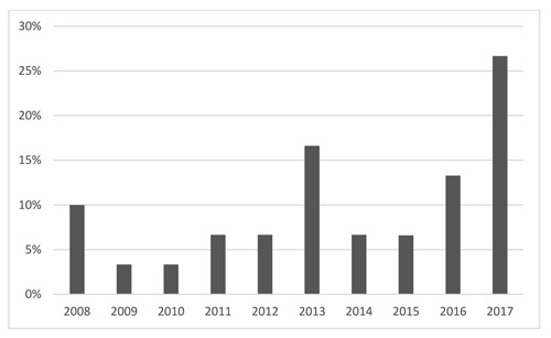 Por otra parte, teniendo en cuenta los años de publicación existe un creciente interés en los últimos cinco; se destaca que el 70,2 % de los estudios fueron publicados durante este lapso de tiempo, como muestra la figura 2.