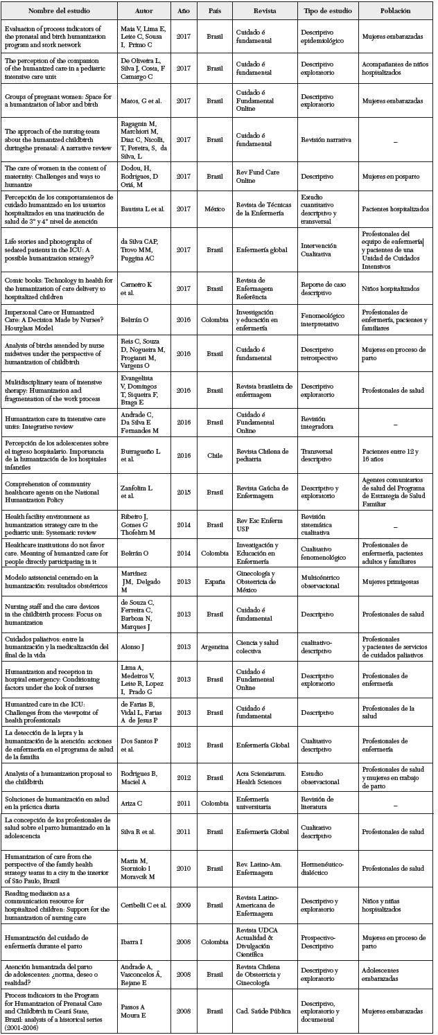 Se establecieron los siguientes criterios de inclusión: a) que los artículos hubieran sido publicados entre los años 2008 a 2017, b) que tuvieran acceso al texto completo, c) que en el título o resumen se encontrara la palabra humanización, d) idiomas inglés o español, e) que el documento fuera un artículo, y e) que el lugar de referencia del estudio fuera Iberoamérica. Se descartaron artículos duplicados en las bases, y se tomó uno solo de ellos. Se excluyeron los artículos que no eran empíricos, aquellos en los que el tema central no correspondía a humanización, que el contexto de trabajo no era de salud y estudios que no presentaron resultados finales.