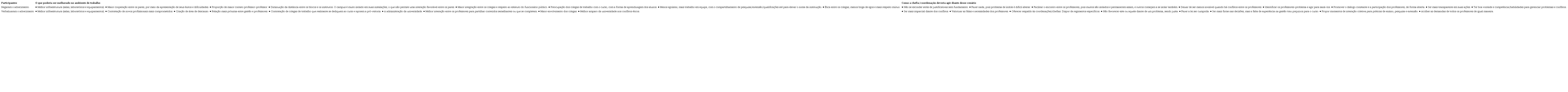Os participantes que negaram o adoecimento apontaram como um dos aspectos a serem melhorados o exercício da ética entre os colegas. Segundo eles, isso pode influenciar na redução de conflitos e no aumento do respeito mútuo. Esses participantes pensam que a chefia/ coordenação deve se posicionar de forma mais rígida e notória, apresentando-se com recursos suficientes para gerenciar conflitos e ponderar situações, não deixando de identificar os professores responsáveis pelas desordens no departamento/instituto e conduzir à solução. Para tanto, devem utilizar o diálogo como instrumento para compreender as ocorrências e aproximar os envolvidos, em uma dinâmica favorável às boas relações de trabalho.