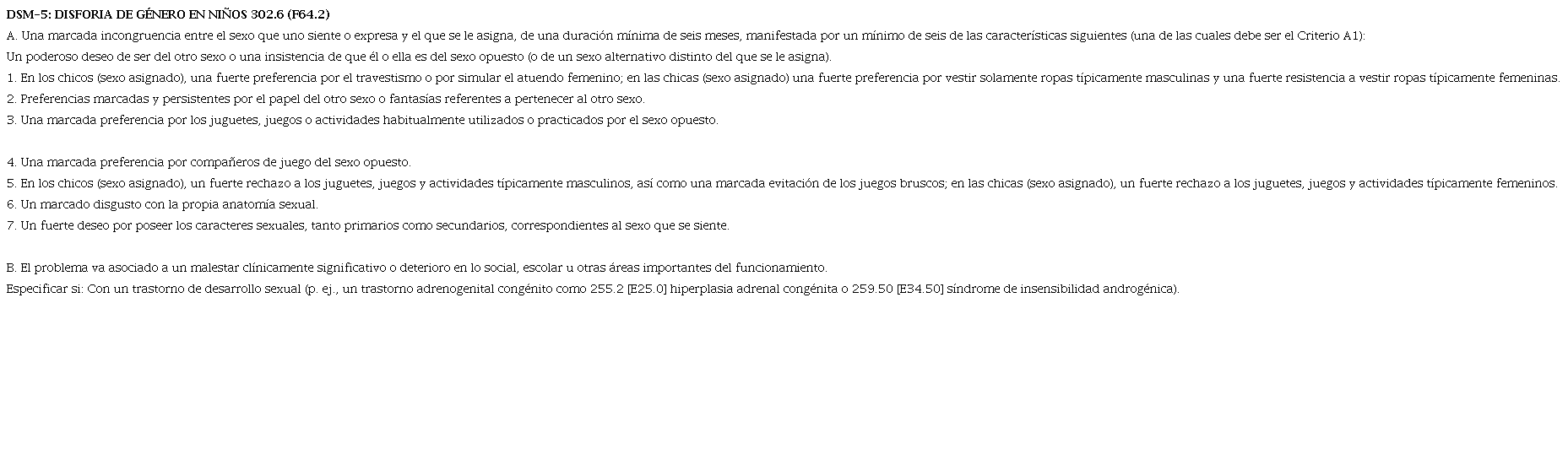 No se incluirá en el análisis la disforia de género en pacientes con trastornos del desarrollo sexual, dado que ellos tienen sus propias particularidades y recomendaciones. Tampoco se profundizará en el tratamiento de adolescentes y adultos.Recuadro 1