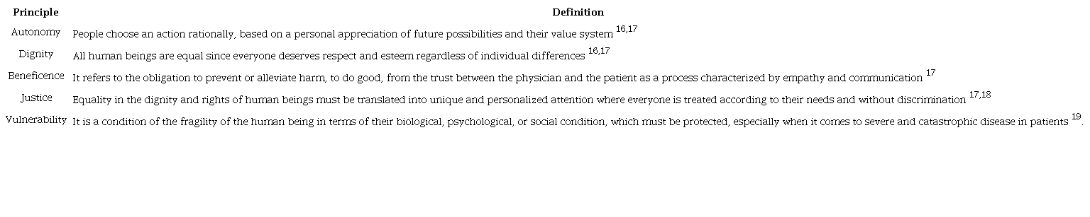 A few years ago, the term Bioethics was alien to the context of the practice of medicine and is currently inherent to it; its objective is to distinguish between “what should be” and what “should not be” in actions that affect human and nonhuman life 14. When it comes to medical action, it is called “medical ethics.” The medical actions based on the four principles mentioned were enriched in the 1990s with the principles of dignity, integrity, and vulnerability 15 (Table 1).
