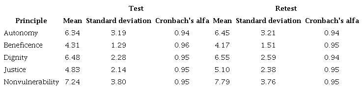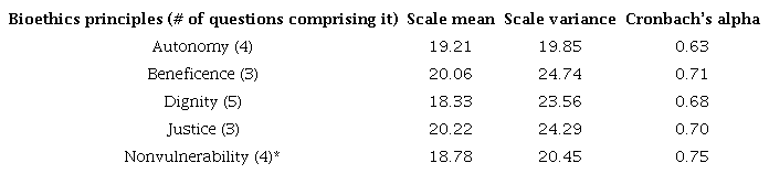 For the pilot, the instrument was administered to 29 patients, obtaining the following values represented in Tables 2 and 3 for Cronbach’s Alpha and the means for each bioethical principle.