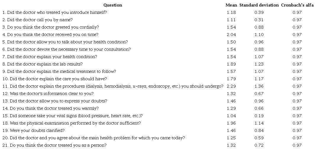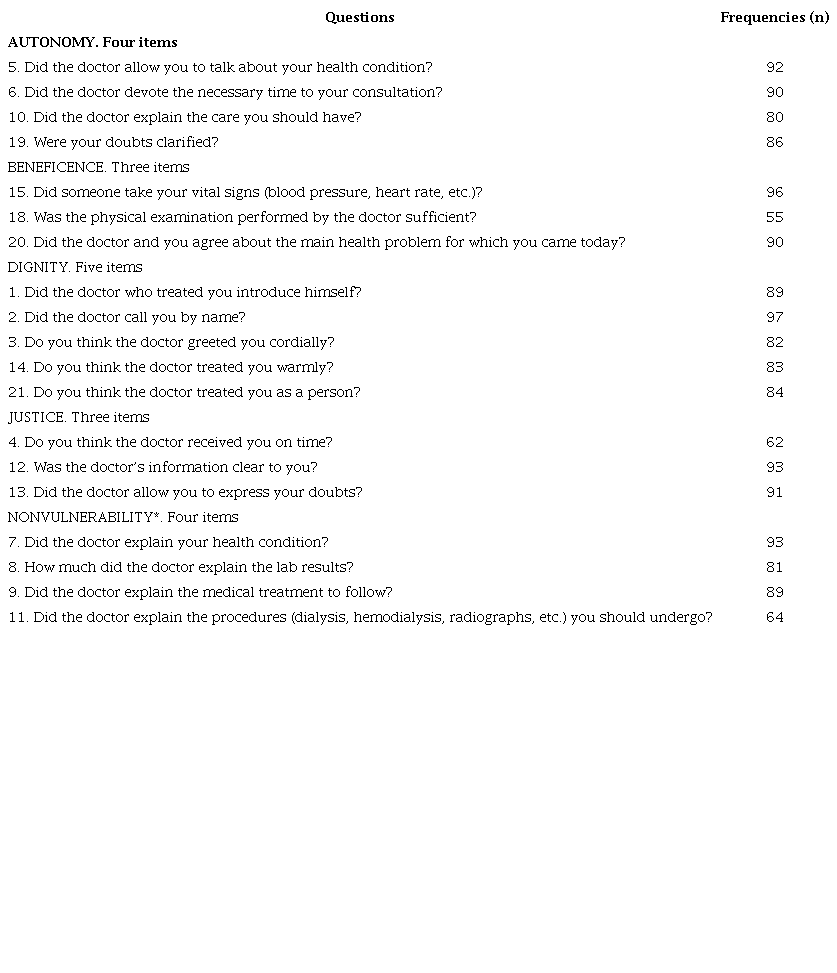 Abstract: Physician-patient relationship (PPR) is a professional-interpersonal relationship that serves as the basis for health management. We aimed to develop an instrument for patients to assess the medical attention received in the outpatient clinic. A 21 question instrument was administered to evaluate its reliability and consistency. The intraclass correlation coefficient was 0.81 (p < 0.05); to fulfill the bioethical principles, the intraclass correlation coefficient was 0.740 (p < 0.05), allowing us to get familiar with the perception of patients who attended the Nephrology Service. The survey showed autonomy as the most reported principle (69 %), followed by dignity (67 %) and justice (60 %). Courtesy, punctuality, and respect make the disease and its treatment more bearable, in addition to promoting the ethics of third parties.