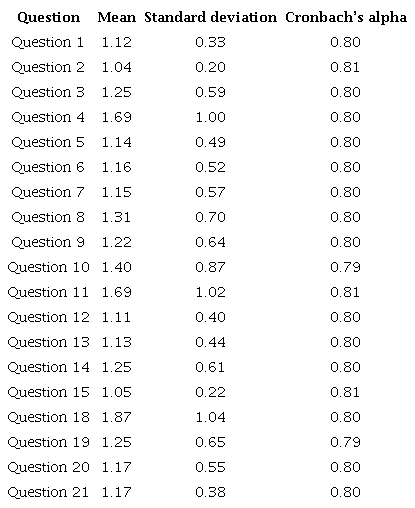 The reliability analysis of the questionnaire was performed, and Cronbach’s alpha was calculated for each question (Table 4), obtaining an intraclass correlation coefficient for the instrument of 0.81 (p < 0.05) with a 95 % confidence interval of 0.75-0.86 (Table 5).