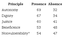It is observed that 69 % of the patients perceive autonomy to be present, followed by dignity and justice, while beneficence and vulnerability are manifested to a lesser extent.