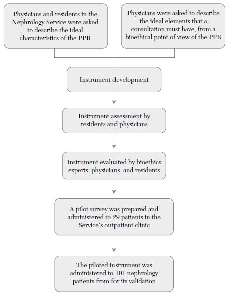 We sought to build an instrument to evaluate the presence of enriched bioethical principles in the care of patients of this service and hospital, which was validated after being piloted and reviewed by health personnel involved and experts in bioethics (Figure 1).