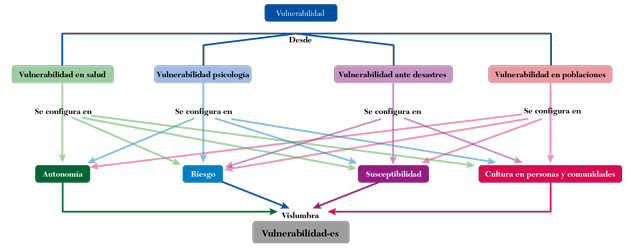 Así, las investigaciones y los hallazgos descritos permitieron vislumbrar que el concepto de vulnerabilidad(es) se construye a partir del tejido de las subcategorías: riesgo, susceptibilidad, autonomía y cultura en personas y comunidades (figura 1), en donde se observa que las precategorías de vulnerabilidad en salud, psicológica y en poblaciones se configuran en las subcategorías emergentes, mientras que la vulnerabilidad en desastres se conforma desde el riesgo, la susceptibilidad y la cultura, mas no en la autonomía.
