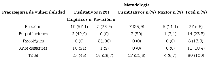 En relación con la disposición metodológica de los artículos, en la tabla 1 se puede observar que predominó la cualitativa (71,7 %), seguida de la cuantitativa (21,6 %) y la mixta (6,7 %). Las precategorías con mayor abordaje fueron salud (45 %) y poblaciones (23,3 %).