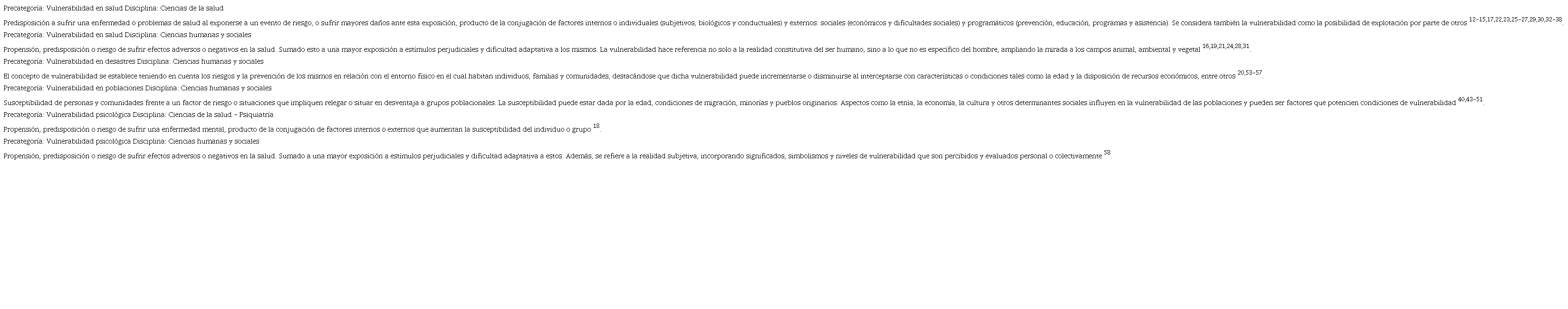 El corpus de los documentos revisados da cuenta de los proyectos de investigación que han abordado la vulnerabilidad, el cual ha sido más explorado desde las ciencias sociales y humanas. En la tabla 2 se puede observar los conceptos centrales identificados en la revisión por área temática y disciplina que lo soportan.