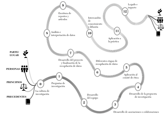 Como se observa en la figura 1, las etapas del viaje de investigación incluyen: 0) la cultura de investigación (personal o de las instituciones y cómo esto configura las prioridades de la investigación); 1) el desarrollo de la pregunta de investigación (si es relevante, pertinente y qué consecuencias podría tener para la comunidad); 2) el desarrollo del equipo de investigación (y las diferentes aproximaciones éticas, metodológicas o políticas que tienen); 3) el desarrollo de asociaciones o colaboraciones (profesionales, intersector o con la comunidad); 4) el desarrollo de la propuesta de investigación (y aplicación a recursos económicos para ejecutarla); 5) la aplicación al comité (o comités) de ética y consideración de las regu laciones vigentes; 6) las diferentes etapas de recopilación de datos (ya sea en el trabajo de campo o laboratorio); 7) los conflictos éticos durante el desarrollo del proyecto y la finalización de la recopilación de datos; 8) los conflictos asociados al análisis e interpretación de datos; 9) la escritura de reportes y artículos (cuestionarse para quién se está escribiendo y cómo puede interpretarse o malinterpretarse); 10) el intercambio de conocimiento y difusión (permitir que los resultados de la investigación beneficien a un público más amplio o pertinente); 11) la aplicación a la práctica (cómo los resultados influyen en el trabajo de agentes relevantes, incluidos los responsables de la política pública, profesionales y comunidades); 12) el legado e impacto de la investigación (incluso años después de que esta ha finalizado).
