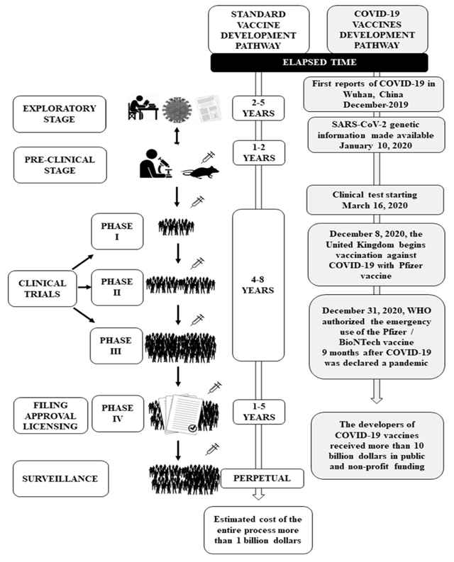 Vaccines have absolute value in health promotion and disease prevention. 5,8 However, their development is characterized by low public investment and a 10 to 30-year long process for pre-clinical stages and clinical tests to reach large-scale production after approval and licensing. 2,3,7,9 In contrast, the development of COVID-19 vaccines has been characterized by generous public funding, speed, and an unimaginable number of COVID-19 vaccines candidates. 3,8 A comparison of the time flow, steps, and investment required for traditional vaccine development versus the current flow of COVID-19 vaccines is shown in Figure 1. 2,7,10-12.
