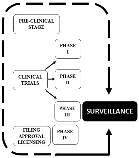 Note that Figure 2 proposes that surveillance ceases to be characterized as the last stage in the vaccine development process as shown in Figure 1 and becomes one of the fundamental requirements of pre-clinical and clinical tests so that ethics requirements are effectively met.