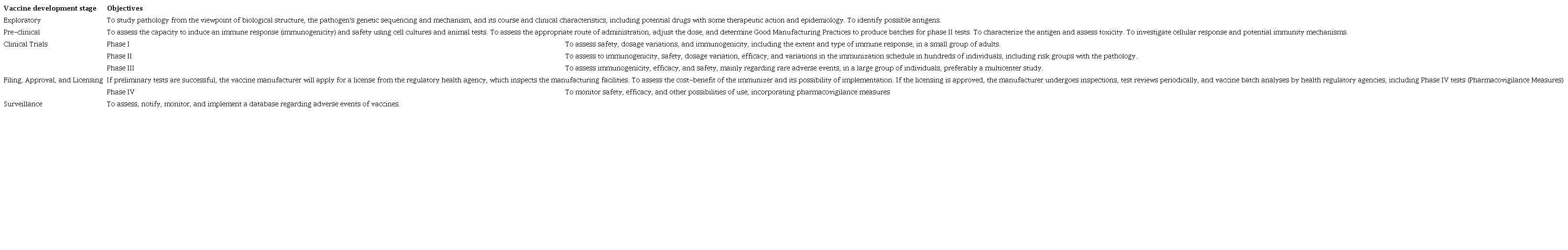 Figure 1 shows an accelerated process for developing COVID-19 vaccines, going from up to 20 years to reach vaccination in a commercial model to about nine months for the first person in the world to be vaccinated against COVID-19 in the United Kingdom, while still in the clinical trial stage. 2,7,10,11,13,14 The traditional vaccine development process is characterized by stages with well-defined objectives, as shown in Table 1. 2,10-12.