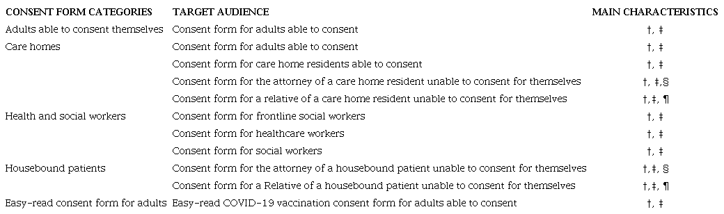 According to Table 3, to adequately comply with the precepts of Articles 3 and 6 of the UDBHR, the NHS has prepared multiple consent forms, even with inclusive language and the possibility of consenting by a health and welfare attorney or a relative of individuals unable to consent for themselves, ensuring compliance with Article 7 (Persons without the capacity to consent) of the UDBHR. 22-24 Furthermore, special attention is given to pregnant, planning pregnancy or breastfeeding. Since vaccines in their initial testing stages do not address these groups, some adverse risks may still be unknown, which ensures compliance with article 8 ( Respect for human vulnerability and personal integrity) of the UDBHR. 4