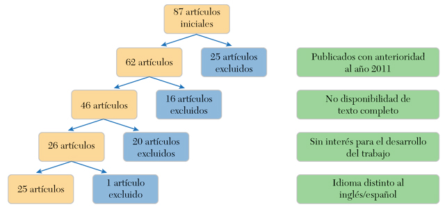 De los 87 artículos iniciales, 25 fueron excluidos por ser publicados con anterioridad al año 2011 (tabla 2). Se escogió dicha fecha ya que fue la primera vez que 9 sociedades científicas españolas establecían, tras una valoración individualizada, la recomendación de vacunar a varones con la vacuna tetravalente. De los 62 artículos restantes, 16 no se seleccionaron por no poder obtener el texto completo. Tras realizar una lectura de título y resumen, finalmente, 20 de ellos fueron excluidos por presentar poco interés o utilidad sobre el tema a desarrollar, y uno de ellos por estar publicado en un idioma distinto al inglés y el español (figura 1).