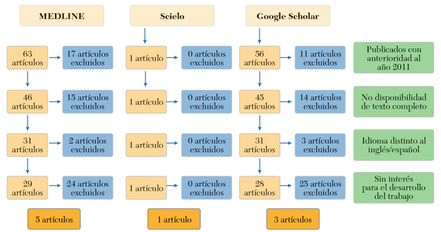 A continuación, se realizó una segunda búsqueda en distintas bases de datos, como Medline, Scielo y Google Scholar, debido a la escasez de artículos en cada una de ellas de forma independiente. Se introdujeron las palabras “ética” OR “bioética principialista” OR “bioética personalista” AND “VPH” AND “vacuna en hombres”. Tras una lectura exhaustiva de los artículos, se seleccionaron aquellos de interés para el trabajo a desarrollar en lo tocante a su aplicación en pacientes varones y sus aspectos bioéticos en la sociedad actual, publicados en revistas de impacto en el campo de la bioética, como Revista de Bioética y Derecho, Acta Bioethica, Persona y Bioética entre otras. Los criterios de inclusión fueron similares a los de la búsqueda anterior, con fecha de publicación a partir del año 2011 y en idioma inglés o español (figura 2).