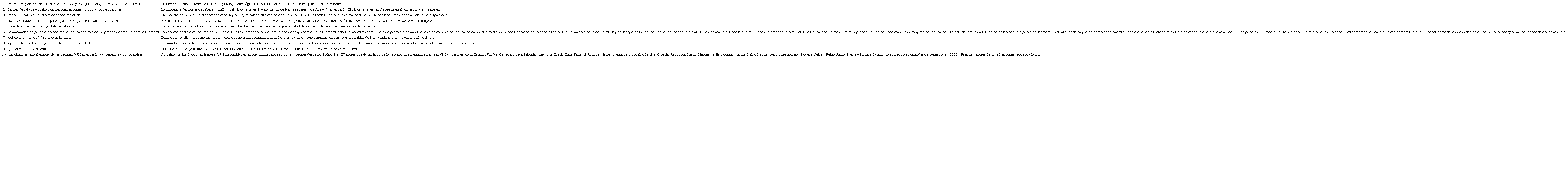Se están publicando revisiones sistemáticas de distintos países y metaanálisis que muestran la efectividad de las vacunas entre 2014 y 2018, con datos de 60 millones de individuos y 8 años de seguimiento, que muestran una sólida evidencia del impacto de los programas de vacunación frente al VPH en niñas y niños, con un descenso significativo de infecciones. Se observa un mayor y más rápido impacto ―tanto directo como a través de la protección grupal― de la vacunación en los países con altas coberturas y múltiples cohortes. De ahí la importancia de alcanzar elevadas coberturas, para así asegurar un elevado impacto de la vacunación.