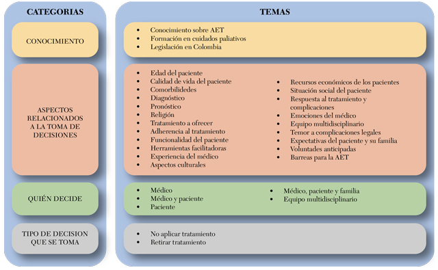 Con este estudio se pretendió obtener información sobre los factores que influyen en un grupo de médicos especialistas para la toma de decisiones de AET. Se encontró una gran proporción de factores que se relacionan con lo descrito en la literatura, como factores sociales, culturales y religiosos; así mismo, también se evidenciaron otros factores relacionados con la enfermedad, además de factores económicos del paciente, el hospital donde se presta la atención, entre otros.