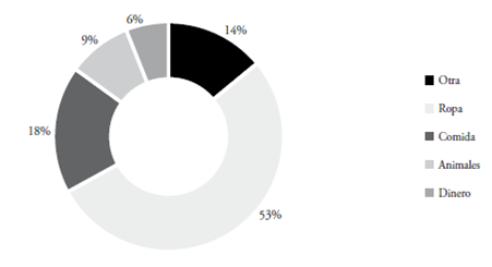 El pago del trabajador siempre fue un hecho personal entre él y el hacendado. Cada pago era diferente y casi nunca se les pagó a dos personas en los mismos días ni menos con los mismos productos. Tres de los cuatro libros de cuentas de Queyilque contienen pagos en detalle14, los cuales muestran que el 53% de los pagos corresponden a géneros u otras especies de ropa, como sombreros y espuelas, mientras solamente el 6% fue en dinero metálico (gráfica 1).