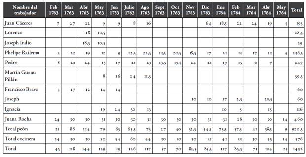 Los libros de cuentas de Miguel Vallejos son el mejor ejemplo que tenemos de los días de trabajo en una hacienda agrícola. Los cuatro libros muestran no solamente quién trabajó en la hacienda durante el año, sino también cuáles días trabajaron. La tabla 1 muestra los días trabajados de los diez trabajadores que contrató Miguel Vallejos entre los meses de febrero de 1763 y mayo de 1764. De ellos, solamente uno trabajaba todos los días, doña Juana Rocha, la cocinera de la casa. Los peones de confianza Phelipe Railemu, Pedro Indio y Juan Cáceres trabajaron solamente entre diez y veinte días mensuales. Los días trabajados muestran que la semana laboral se definió entre lunes y viernes solamente con las cocineras trabajando durante el fin de semana. Pedro, el peón, con la mayor cantidad de días trabajados, tuvo un promedio de quince días de descanso por cada treinta días trabajados. Aun él, siendo el peón de confianza de la hacienda, solamente trabajó nueve días en el mes de junio, cuando las lluvias invernales detuvieron todo trabajo agrícola.