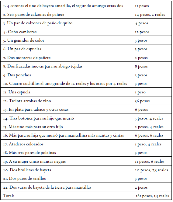 Los géneros como paños de Bretaña y Castilla eran los más populares y explican por qué el 53% de los pagos vinieron de esta forma. Algunos también compraron hilo blanco y cintas de varios colores. En 1761, el mayordomo Joseph Gavilán recibió la mitad de su sueldo en paños de Castilla, mientras que, en el mismo año, cuatro de sus compañeros recibieron ponchos o sombreros. Cuchillos y espuelas también fueron populares con los hombres, especialmente para los que solo trabajaron por quince o treinta días (anh, JP, leg. 12, pieza 14, f. 279). Finalmente, en 1762, las dos cocineras recibieron tela de seda azul para hacer unos vestidos. Más importante es que hay una concordancia estrecha entre los precios de los productos pagados a los trabajadores y sus precios en las cuentas de compras con los comerciantes regionales, que compraron la cosecha de la hacienda con telas y géneros de Concepción. No hubo un alza general en los precios de los productos comprados de los comerciantes regionales en el momento de entregarlos como salario. También es posible que los trabajadores seleccionaran los productos que quisieron recibir entre los que trajeron los comerciantes regionales en sus visitas a la hacienda.