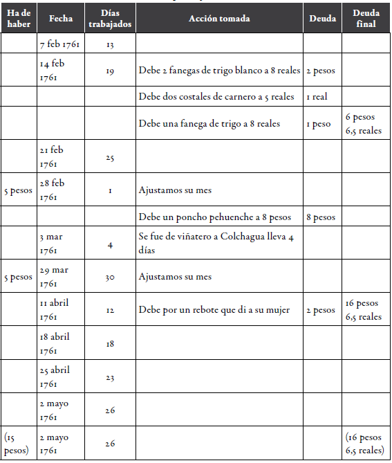 La tabla 3 muestra una porción de la cuenta de Phelipe Raylemu en los tres meses de 1761; allí se ve que Phelipe trabajó un total de 73 días. Por su salario, se puede deducir que hizo compras de trigo, carne y accesorios personales para su familia. Por ejemplo, el 28 de febrero compró un poncho pehuenche por 8 pesos y, algunos días después, pagó una deuda de 2 pesos que tenía su mujer con el hacendado. Al final de la hoja, Phelipe había acumulado 15 pesos de pago y casi 17 pesos de descuentos. Por el total de 1761, Phelipe recibió 39 pesos de descuentos con un saldo positivo de casi 4 pesos en su cuenta (anh, JP, leg. 12, pieza 14, ff. 276 y 278).
