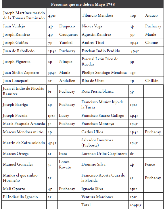 Cada libro de la hacienda de Queyilque muestra una lista general de sus deudores y deudas, donde incluyó las deudas o balances positivos de sus trabajadores y extrabajadores. Varias listas similares de las haciendas jesuitas y las particiones de bienes de varios hacendados (anh, RA, vol. 1846, pieza 4; anh, RA, vol. 2275, pieza 2; anh, RA, vol. 2760, pieza 2a) han sido estudiadas. Por ejemplo, el testamento de don Juan Cruz de la Jara, un hacendado de Yumbel, contiene una lista de más de cincuenta deudores, la mayoría con deudas pequeñas entre 5 y 10 pesos, que corresponden a las cuentas de sus trabajadores (anh, NY, vol. 1, ff. 88-94). Los trabajadores agrícolas del siglo XVM el obispado de Concepción no manejaron deudas grandes porque se les pagó de a poco y porque los hacendados nunca tuvieron géneros y productos de sobra para adelantarles16.