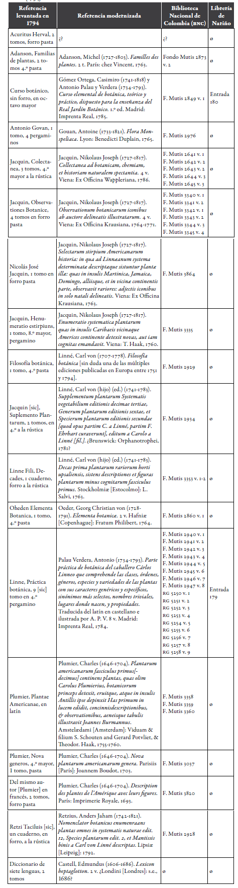 El paralelo de la biblioteca en manos de Zea con la de Nariño muestra que la curiosidad de este último por la ciencia amable de las plantas dependia de las orientaciones del RJB, y que por lo relativo a la botánica su librería no competía ni mucho menos en especialización con la de Mutis y tampoco con la selección en poder de Zea.