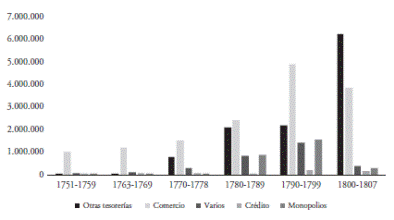 El reformismo borbónico permitió la apertura del comercio caraqueño hacia el exterior con la promulgación del decreto de comercio libre, lo cual, acompañado de la eliminación de privilegios a la Compañía Guipuzcoana, fortaleció el papel de la administración real para el manejo de los fondos provenientes de los gravámenes comerciales y dinamizó la remisión de fondos de las demás cajas en el área de influencia de la capital. Esto acontecía en medio de un gran cambio institucional, el cual favoreció la integración del actual territorio venezolano en términos fiscales, con la creación de la Intendencia y el Tribunal Mayor de Cuentas; militares, con la instauración de la Capitanía; comerciales, con la institución del Consulado; y judiciales, con la puesta en marcha de la Real Audiencia. Todo ello para garantizar el control de la Corona sobre una posesión que era manejada por compañías comerciales. Lo anterior se tradujo en el aumento de los cargos totales, en especial de los gravámenes comerciales y las remisiones de otras cajas, así como de las datas en el ámbito administrativo y militar. Sin embargo, el éxito de las medidas dependía de mantener un comercio externo libre de sobresaltos, los cuales estuvieron a la orden del día desde 1793 debido a las guerras de España contra Francia y luego contra Inglaterra. Estas guerras trastornaban el flujo de mercancías y el dinamismo de las actividades económicas de la capital, y hacían necesaria la aplicación de medidas como la apertura del tráfico con colonias neutrales o extranjeras, lo cual permitía la fuga del excedente por vía comercial a manos de los enemigos de la monarquía hispana.