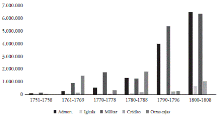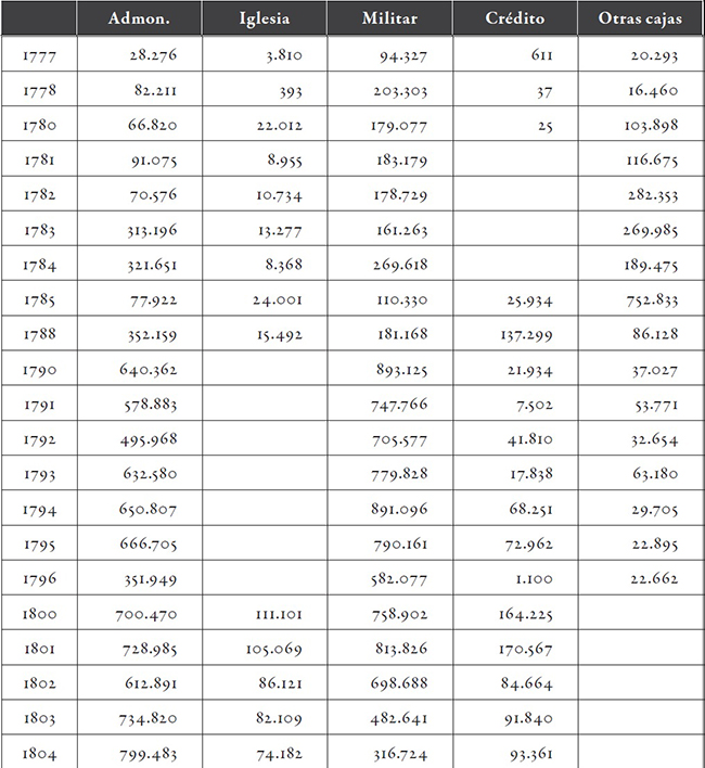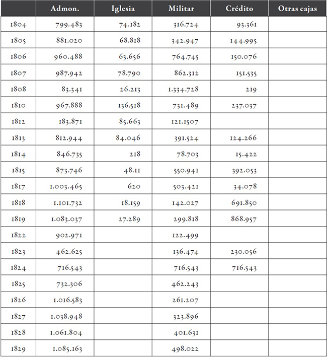 De esta forma, la Caja de Caracas se hizo dependiente de las remisiones de otras y del crédito, con lo cual perdió su capacidad como fuente generadora de excedente con destino a la metrópoli y a sus similares en la Intendencia. Ahora a duras penas cubría sus gastos más importantes. Varios son los factores que lo explican, a saber: la ruptura de la estructura administrativa producto de los cambios políticos, las reformas fiscales de los primeros experimentos republicanos, el deterioro de la producción de cacao como principal fuente de financiamiento de las importaciones y el estado de guerra. Si bien es cierto que desde 1815 se gozó de cierta estabilidad, ello no recompuso del todo el aparato de gobierno español ni la dinámica de producción cacaotera previa a la Independencia, lo cual obligó a las autoridades a recurrir al crédito, lastre que cargará al momento de su integración en la naciente República de Colombia.