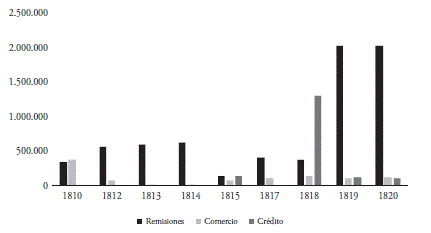 En este escenario, los ingresos de la caja sufrieron una importante trasformación respecto al periodo anterior, en términos de composición. Mientras que durante la implementación de las reformas borbónicas la preponderancia la tenían los impuestos al comercio, con una nula participación del crédito, ahora el rubro fundamental eran las remisiones de otras tesorerías con el 60% del total, seguidas por el 14% de préstamos y el 9% por los impuestos al tráfico de mercancías. Estos tres rubros eran los superiores. Como se ve en la figura 3, el ingreso total se mantuvo estancado entre 1810 y 1815, momento en el cual sufrió un incremento significativo, con pendiente de 10.145, producto del restablecimiento del orden del Gobierno español en la ciudad. El análisis desagregado de los rubros más importantes del ingreso corrobora esta hipótesis. En efecto, vemos cómo en 1810 los gravámenes comerciales cumplían un papel importante; sin embargo, este se paraliza hasta 1814, cuando tienen un leve incremento, sin igualar los resultados anteriores. Las remisiones de otras cajas se muestran estancadas en el primer quinquenio y se disparan en el segundo, gracias a las remisiones del exterior provenientes de Panamá, Puerto Rico y Santa Marta, así como de las provincias afectas al Gobierno recién restaurado, como Cumaná y Maracaibo. Por otra parte, el crédito se hace necesario para el financiamiento de la fuerza militar y de las instituciones civiles recién recompuestas.