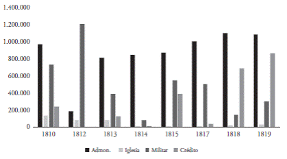 En cuanto a los gastos, estos registraban una tendencia más acelerada de incremento que la de los ingresos, con una pendiente total de 42.406. La composición muestra que, a pesar de la guerra, la administración fue la principal preocupación de gobierno, ya que sumó el 51% del total, seguida del ámbito militar, con el 29%, el servicio de deuda, con el 17%, y la Iglesia, con el 3%. Las remisiones hacia España y cajas subalternas desaparecieron por completo. La figura 4 muestra cómo el gasto administrativo tuvo un comportamiento estable, con una leve tendencia al alza. El único bache fue 1812. Los gastos de guerra son significativos en los primeros años, para ir decayendo tras la restauración del orden español, contrariamente a lo que ocurre con el servicio de deuda, el cual es cada vez más abultado.