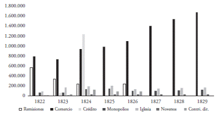 En ese contexto, los ingresos doblaron la tendencia al alza con respecto al periodo anterior, con una pendiente de 23.160 entre 1822 y 1829. En términos de composición, los ingresos volvieron a ser comandados por los gravámenes al comercio, los cuales sumaban el 63% del total, seguidos por el 10% de las remisiones de las tesorerías provinciales, el 9% del crédito y de la Iglesia cada uno. Los monopolios aportaban tan solo el 6%. La figura 5 evidencia cómo a lo largo del periodo los gravámenes al comercio se van convirtiendo en el pilar del sostenimiento de la caja, siendo casi la única fuente de recursos al final, pues las remisiones de cajas provinciales pesaron solo en los primeros años, y el crédito en 1824, producto de la llegada de los fondos del empréstito inglés concedido a la República de Colombia.