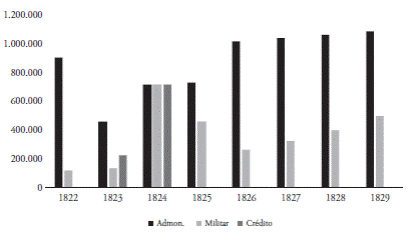 Por otra parte, los gastos seguían una espiral ascendente, mucho más pronunciada que la de los ingresos, con una pendiente de 57.122. Su composición muestra el peso que adquirió el rubro administrativo, el cual ocupó el 64% del total, seguido por el 27% del militar y el 9% del crédito. La figura 6 muestra cómo a lo largo del periodo se fue estableciendo el gasto administrativo como preponderante, al tiempo que se consolidaban las instituciones republicanas y caía la participación del gasto militar. Es notable cómo en 1823 y 1824 el servicio de la deuda tuvo un papel protagónico, debido a que gran parte de los fondos del crédito externo fueron usados para el pago de obligaciones internas causadas durante el periodo de guerra, recursos que también se emplearon para cubrir obligaciones con empleados civiles y militares, lo cual determinó el equilibrio del gasto entre los tres en 1824.