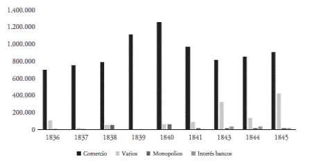 Desórdenes internos, economía de crecimiento lento e inestable, junto con la eliminación de la estructura de impuestos colonial, fueron el fondo que definió la dinámica y la composición de los ingresos de la Tesorería de Caracas entre 1830 y 1845. La pendiente muestra un valor de 49.124, con una participación preponderante de los gravámenes comerciales con el 84%, seguidos por los ingresos varios con el 13%, los monopolios con el 2 % y los intereses producidos por el Banco Nacional con un 1%. La figura 7 muestra cómo los gravámenes comerciales aumentaron hasta 1840, año en el que cayeron, y quedaron estancados posteriormente, razón por la cual el Estado recurrió en mayor grado a recursos de tipo extraordinario para suplir sus necesidades, gracias a que rubros ordinarios como los monopolios y los intereses bancarios tenían un papel insignificante, además de mostrarse estancados.