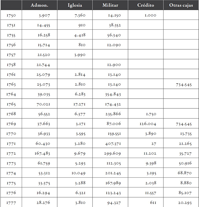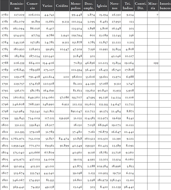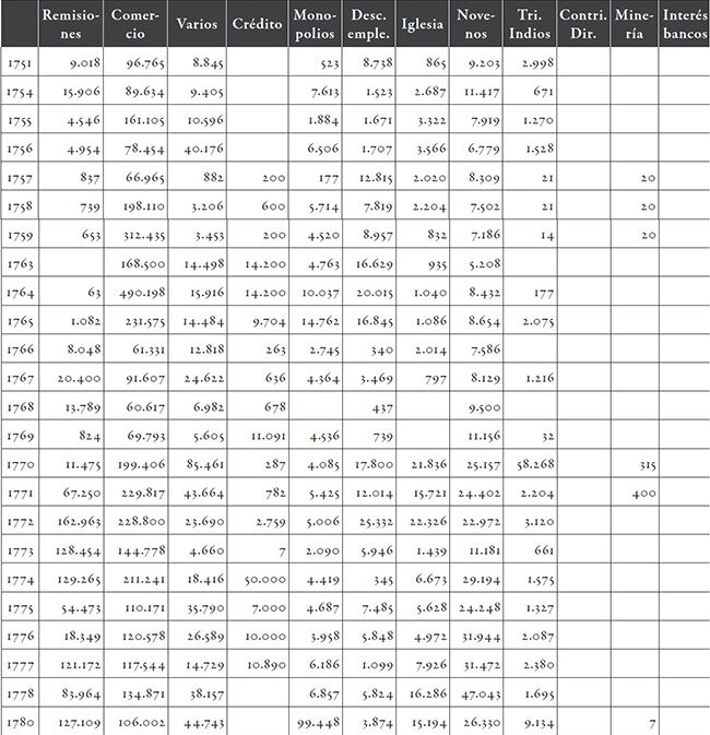 Uno de los errores más comunes en la historiografía ha sido asimilar cargo a ingreso y data a egreso, lo que ha sido aclarado por el reciente trabajo de E. Sánchez. En efecto, los cargos y las datas incluyen gastos e ingresos efectivos, pero además de ello remisiones de otras tesorerías, existencias de años anteriores y suplementos y contrapartidas para el equilibrio contable. De allí que la Corona ordenara la elaboración de estados generales de valores y distribución que consideraran solamente el ingreso y el egreso efectivo, a diferencia de los cargos y las datas, debido a que con base en ello se hace prácticamente imposible componer un cuadro general de un territorio amplio, pues se esconden las remisiones de otras tesorerías y se hace caer en el error de la doble contabilidad. Tomando en cuenta esta limitación, hemos depurado hasta donde ha sido posible estas cifras de la Caja Real de Caracas para el periodo 1751-1821. Así, eliminamos existencias, depósitos, devoluciones, suplemento y demás ramos de contrapartida contable, los cuales no son necesarios para los estados generales de ingreso y egreso entre 1822 y 1845, pues seguían las observaciones que desde finales del siglo XVIII se tomaban en cuenta para la construcción de las relaciones de valor y distribución.