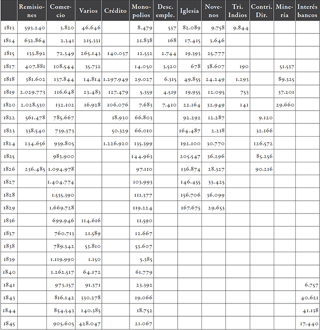 La concentración de los ingresos en las remisiones y la práctica desaparición de los provenientes del tráfico de mercancías son los reflejos de la política cambiante de la década, así como el crecimiento de los gastos en la lista civil, el errático comportamiento de las erogaciones militares y el acelerado protagonismo alcanzado por el servicio de deuda.