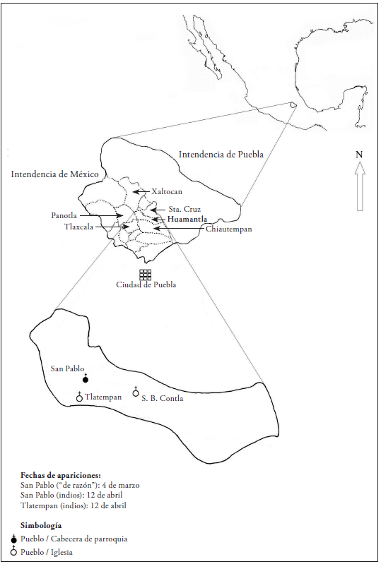 En 1793 la provincia de Tlaxcala dependía del obispado de Puebla y, administrativamente, su jurisdicción eclesiástica estaba integrada por veintidós parroquias y un par de santuarios9. En la figura 1 se identifican los pueblos pertenecientes a la parroquia de San Pablo Apetatitlan10.