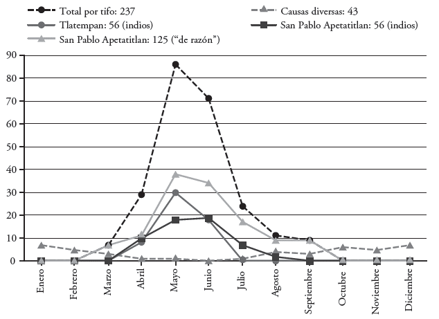Es necesario matizar que la parroquia de San Pablo Apetatitlan estaba integrada por los pueblos de San Bernardino Contla, Jesús Tlatempan y San Pablo Apetatitlan y, en cuanto a los barrios, San Bernardino tenía doce, San Pablo dos y Tlatempan ninguno. Según la estructura social étnica, la población estaba constituida por familias "de razón" e indígenas. En el primer grupo se encontraban los españoles, moriscos, mestizos e indios caciques y, en el segundo, los indios. La mayoría de las personas "de razón" era de ascendencia española y, al igual que las familias indígenas, preferían vivir en el área urbana de la cabecera. Tanto en San Bernardino como en Tlatempan predominaban los indígenas. Dado que un porcentaje considerable de familias españolas gozaban de solvencia económica11, cabe la posibilidad de que las enfermedades asociadas con la higiene las afectaran mínimamente, incógnita que resolveré al identificar los estatus sociales de las familias que vivieron o sobrevivieron a la epidemia.