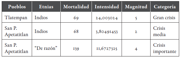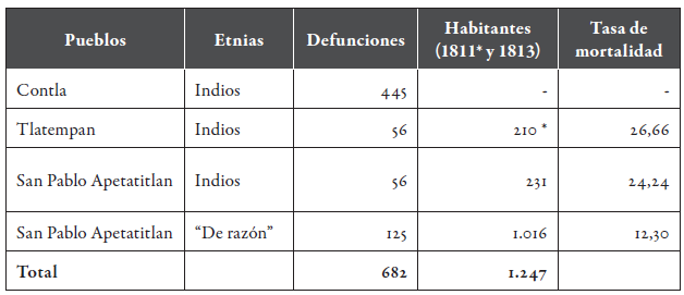 Después de que en la jurisdicción parroquial terminó la epidemia de tifo, la cifra de muertos fue de 682 personas. De conformidad con la distribución proporcional, el 65,24 % fue para Contla, el 26,53 % para San Pablo Apetatitlan y el 8,21 °/o para Tlatempan (tabla 1). Por etnias, los indígenas de los tres pueblos aportaron el 81,68 % y los "de razón" el 18,32 %. La tasa de mortalidad pone al descubierto una perspectiva más cercana del impacto epidémico.