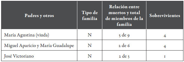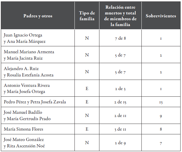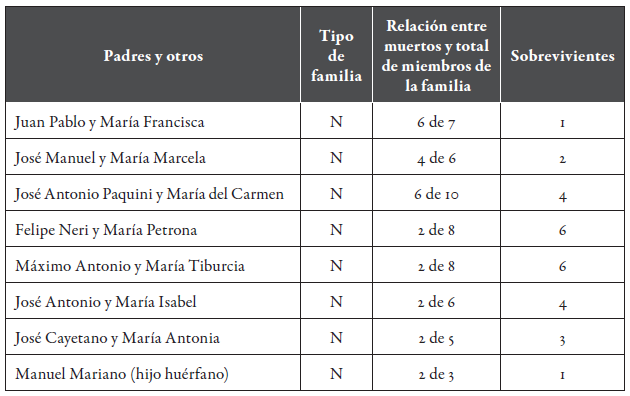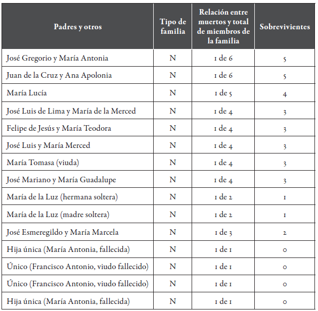 Desafortunadamente, las muertes de María Antonia, Francisco Antonio, María Antonia y Francisco Antonio significaron las extinciones de sus familias. En otros casos, el que María de la Luz evitara el contagio posibilitó la continuidad de su estirpe familiar; la misma "fortuna" tuvieron la madre soltera María de la Luz y el matrimonio de José Esmeregildo y María Marcela (tabla 9).