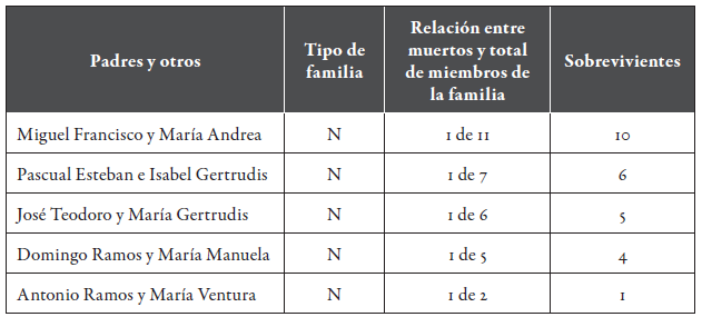 Conviene advertir que otras familias sufrieron la pérdida de la mitad de sus integrantes. En el hogar de José Gregorio y María Antonia murieron tres de seis miembros, dos de cinco integrantes en la familia del viudo Juan de la Cruz y dos de cuatro en los hogares de José Mariano y María Felipa, la viuda María Tomasa y en el matrimonio formado por Juan Lorenzo y María Luciana.