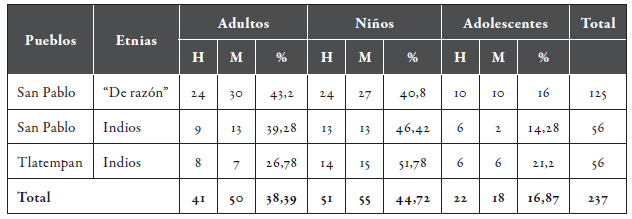 Según el padrón de 1813, la cabecera parroquial estaba habitada por 210 familias "de razón" y 63 familias indígenas. En 1811 Tlatempan tenía 57 familias indígenas (tabla 4). Proporcionalmente, en la cabecera vivían 1.247 habitantes y en Tlatempan, 210. Dado que en los espacios más poblados los vectores suelen extenderse a un mayor número de personas, conviene desglosar la mortalidad por etnias, sexos, edades y, por excepción, hogares.