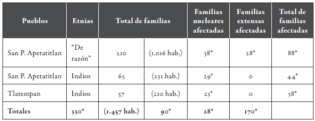 De acuerdo con las cifras de la tabla 1, la tasa de mortalidad conjunta de la población indígena alcanzó el 50,9 % y el 12,30 % para los "de razón"; pero, por área geográfica, nótese que en San Pablo Apetatitlan se concentró el máximo daño (36,54 %). Antes de desglosar con detalle dicha singularidad, advierto que por la inexistencia de un padrón de San Bernardino que anteceda la epidemia decidí excluirlo del análisis específico de los muertos y sobrevivientes por familias. Entonces, si la insalubridad determina la evolución del tifo, se infiere que los habitantes de cualquier estatus social desatendieron las normas básicas de higiene -el aseo del cuerpo y de sus ropas- y, paralelamente, la inalterable comunicación personal por motivos familiares, festejos religiosos o abastecimiento de mercancías.