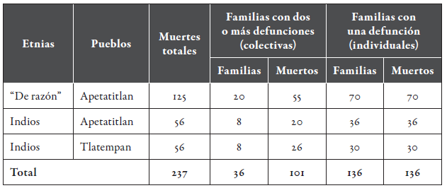 Según la fórmula de Jacques Dupâquier, los indígenas de Tlatempan sufrieron la magnitud 5 o gran crisis de mortalidad; los "de razón", la magnitud 4 o crisis importante, y los indios de la cabecera, la magnitud 2 o crisis media (tabla 3)13. Si bien fue un duro golpe demográfico para las áreas micro del centro de Tlaxcala, en otras regiones de la Nueva España, específicamente en las ciudades de Guadalajara y México, también se vivieron magnitudes 5 o de gran crisis demográfica (Oliver). A pesar de la ausencia de la medición de mortalidad, Molina del Villar (126) anota que en el pueblo mexiquense de Atlacomulco fallecieron 1.134 personas y, al parecer, se dio un descenso de una tercera parte de la población. Regresando al caso tlaxcalteca, es de destacar el hecho de que por la conjunción de cifras en la cabecera haya ocurrido la magnitud de mortalidad 6. ¿Cuántos fallecieron y cuántas familias fueron afectadas? Es el momento de conocer el efecto específico provocado por el tifo.