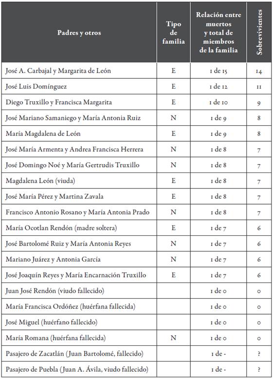 Las familias que vivieron la muerte de uno de sus integrantes rebasaron las seis decenas: 28 extendidas y 38 nucleares (tabla 4). Valorados como favorables, los hogares de los Carbajal-León, Domínguez-Avendaño y Truxillo-Francisca Margarita (de quince, doce y diez miembros respectivamente) solo perdieron a uno de sus integrantes; el mismo efecto se registró en un par de familias de nueve miembros, en cinco de ocho y en cuatro de siete. Otras familias de mediana extensión (seis de seis, seis de cinco, catorce de cuatro y diez de tres) también tuvieron la fortuna -¿o acaso tomaron la debida precaución?- de perder solo a uno de sus integrantes (tabla 7). Las extinciones de familias las abordaré en otro apartado.