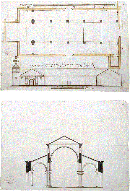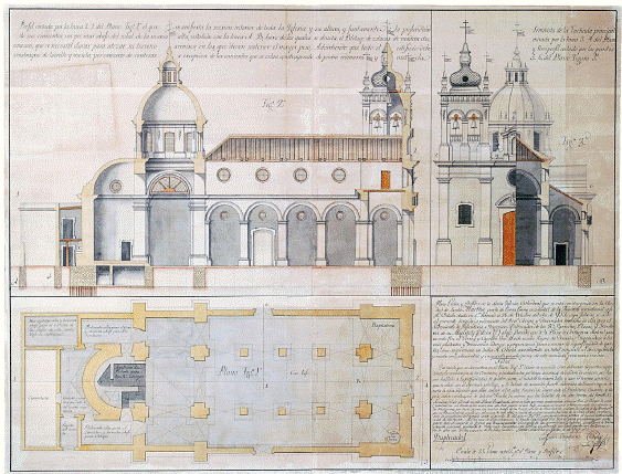 El plano se completa con una sección del frente y del lateral de la catedral en la parte superior. En sendos dibujos Chacón mostró la cúpula que debía cerrar el crucero, concebida sobre un tambor circular y rematada por una linterna, de acuerdo con los postulados clasicistas. La inserción de una cúpula en el crucero ha sido relacionada con el modelo altamente divulgado en América por influencia de la Compañía de Jesús, como demuestra el caso de la iglesia de San Ignacio de Bogotá (Corradine 222). Además, se puede comprobar cómo la nave central es de mayor altura que las laterales, lo que permitió la inclusión de unas claraboyas circulares que iluminaban los tramos centrales de la iglesia. Igualmente novedosa en los contextos neogranadinos resultó la bóveda de cuarto de esfera ideada para el cierre de la cabecera, adaptando una solución ya manejada por los arquitectos italianos del Renacimiento. Entre otros, solución similar dispuso Andrea Palladio para los brazos de sus iglesias venecianas. Lo anterior demuestra un conocimiento por parte de Chacón de los repertorios constructivos recogidos en la literatura artística. Asimismo, la combinación de arcos de medio punto, pilastras toscanas dividiendo los tramos de la fachada y la escasez de decoración ahondan en el carácter clasicista del conjunto. En este sentido, las normas constructivas conocidas por el ingeniero durante su periodo de formación en la Academia de Matemáticas de Barcelona condicionaron el diseño de la nueva catedral. Durante el segundo curso del plan de estudios de dicha institución, los tratados de arquitectura renacentistas constituían las principales fuentes de aprendizaje para los cadetes, quienes aplicarían los modelos en sus diseños. Así, primero la Regla de Vignola y después el Compendio del padre Tosca incluían distintas anotaciones sobre las proporciones y medidas que encauzaron a los ingenieros hacia unos cánones clasicistas (Carrillo de Albornoz 101-116). Por todo ello, es posible que Chacón conociese estos diseños por medio de estampas, lo que habría influido en su propuesta del alzado exterior de la catedral samaria, en la que se apartó de la sobriedad y pobreza constructiva de otros edificios coetáneos.